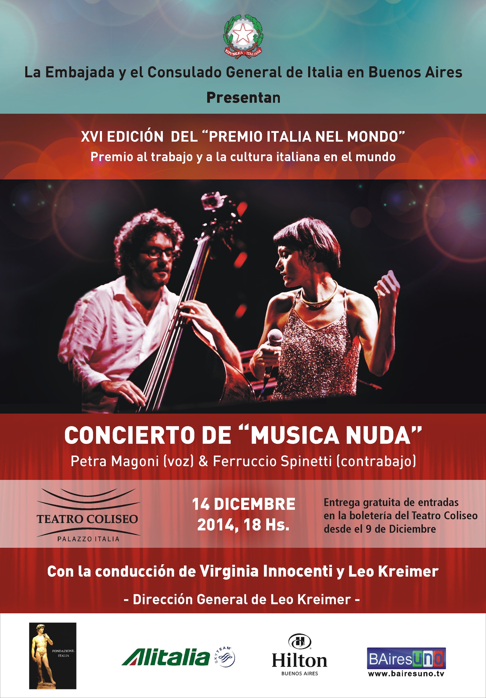 Al Teatro Coliseo di Buenos Aires il 14 dicembre p.v., si è svolta la XVI edizione del Premio Italia nel Mondo , premio al lavoro e alla cultura italiana nel Mondo, promosso dalla Fondazione Italia (no profit) con l'Ambasciata d'Italia, e il Consolato Generale d'Italia.