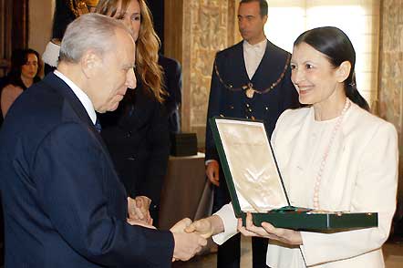 Il Presidente Ciampi consegna le insegne dell'onorificenza di Cavaliere di Gran Croce a Carla Fracci, nel corso della cerimonia al Quirinale