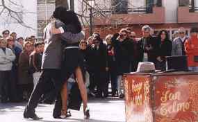Si tratta di un vero esercizio di concentrazione. I primi tangueros di cortile non lo improvvisano, se pur nemmeno frequentano corsi presso maestri professionisti: è durante la settimana, dopo il lavoro, che piccoli gruppi di uomini provano e riprovano fra loro i passi, mentre altrove le donne fanno la stessa cosa, per preparasi al ballo della domenica. Perchè il tango (e ci teniamo a sottolinearlo a dispetto di chi, senza conoscerlo, vuole identificarlo con un assoluto "pensiero triste che si balla") è divertimento, non solo lanciandosi in pista alla festa o nel salòn, ma anche facendo parte di allegre e chiassose comitive che si ritrovano per provare e ripetere. Il tango è un ballo totalmente libero, privo di coreografie predefinite. Mentre le altre danze si fondano su una figura di base da ripetere alternandola a qualche occasionale variante, il tango è del tutto privo di schemi ripetitivi. La salida basica è solo una combinazione di passi che si utilizza per imparare a ballare (cioè a ... non ripeterla), mentre le figure classiche (ocho adelante, ocho atràs, mordida, medialuna, ecc) vengono continuamente assemblate, sospese, frammentate e ricombinate, in una unica caleidoscopica figura che non si ripeterà mai uguale. Le coppie non procedono mai in modo fra loro coerente: ognuna segue di volta in volta direzioni diverse (e la necessità di evitare le collisioni impone ulteriormente di decidere istante per istante il passo da eseguire), anche se viene complessivamente mantenuta una lenta rotazione in senso antiorario. Più che dell'Argentina, il tango è il ballo del Rio de la Plata, cioè delle città di Buenos Aires e Montevideo, due metropoli che si affacciano da sponde opposte all'estuario del grande fiume, e che al di là dell'appartenenza a due entità statali diverse, sono molto più vicine fra loro per storia, composizione etnica, cultura, di quanto ciascuna non lo sia rispetto al resto della nazione di cui è capitale. Ma il tango non è la sola danza rioplatense: i tangueros sono soliti alternarlo alla milonga e al vals criollo. La milonga è caratterizzata da un tempo molto più veloce di quello del tango, con un ritmo semplice, regolare e sincopato. La danza è piena di brio, con figure semplici: essenzialmente una camminata continuamente spezzata, con una forma tipica di ocho sia dell'uomo che della donna (ocho milonguero), e poche altre figure, necessariamente agili, data la velocità. Spesso la si balla senza la classica presa: ciascuno tiene le mani allacciate dietro di sè, mentre la fronte si appoggia a quella del partner (secondo alcuni questo stile sarebbe invenzione della nota cantante Tita Merello, che in una occasione dovette nascondere al pubblico una improvvisa ampia scucitura nella propria gonna). Il vals criollo è basato sul ritmo del valzer viennese, ma i movimenti sono quasi gli stessi del tango (generalmente un passo sul primo tempo di ogni battuta). Viene chiamato anche vals cruzado per il continuo cambiar direzione nel movimento della coppia. Anche il classico ritmo della mazurca ungherese è diventato per i rioplatensi un proprio ballo chiamato ranchera, mentre costituiscono una realtà a sè stante è gli altri balli argentini, denominati balli de l'interior o folcloricos. Si tratta di danze più antiche, nate in contesti del tutto differenti dalle realtà urbane già descritte. Nei vasti territori che si estendono fra la Patagonia, le Ande e le giungle della Bolivia e del Chaco, nei pueblos, dalla commistione di tradizioni indie e ispaniche sono sorte la zamba, a coppie separate, a tempo lento, fatta di sguardi e ammiccamenti che ricordano il corteggiamento amoroso, la cueca - diffusa anche in Cile - anch'essa a coppie separate, con battito di tacchi e agitare di fazzoletti, dal tempo vivace e marcato.